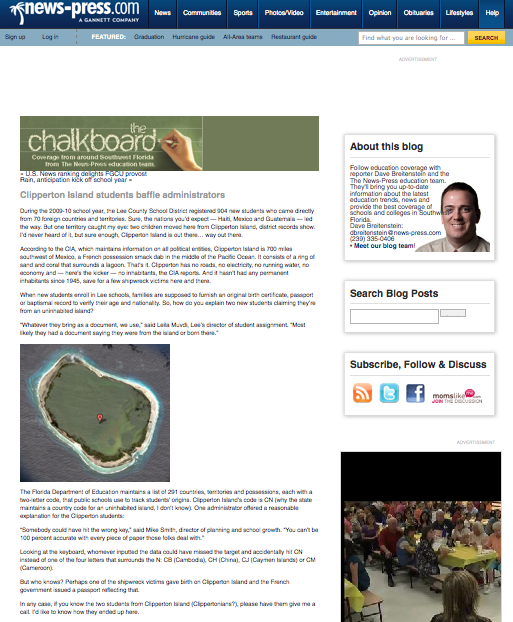 In examining records on students’ countries of origin, one nation stood out — Clipperton Island. I’d never heard of it, but sure enough, Clipperton is out there… way out there. It has no roads, no electricity, no running water, no economy and, according to the CIA, no inhabitants. So how do you explain two students claiming they’re from an uninhabited island?